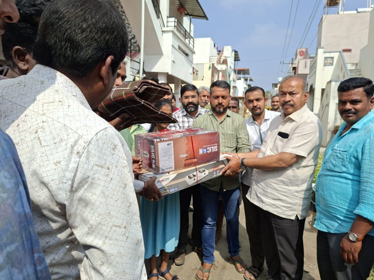 ಶಿವಮೊಗ್ಗ, ಇತ್ತೀಚೆಗೆ ಶಿವಮೊಗ್ಗ ನಗರದ ಸಿದ್ದೇಶ್ವರ ನಗರದಲ್ಲಿ ಸಂಭವಿಸಿದ ಗ್ಯಾಸ್ ಸ್ಫೋಟದಿಂದ ಹಾನಿಗೊಳಗಾದ ಕುಟುಂಬಗಳಿಗೆ ಶಾಸಕರಾದ ಎಸ್ ಎನ್ ಚನ್ನಬಸಪ್ಪ ಅವರು ವಿಷ್ಣು ಸಮಾಜ, ವಿಕಾಸ್ ಟ್ರಸ್ಟ್ ಹಾಗೂ ಬಟ್ಟೆ ವರ್ತಕರ ಸಂಘದ ಸದಸ್ಯರೊಂದಿಗೆ ಭೇಟಿ ಮಾಡಿ, ಅವರ ಸಹಕಾರದೊಂದಿಗೆ ದಿನನಿತ್ಯ ಬಳಕೆಯ ಅಗತ್ಯ ವಸ್ತುಗಳು, ಬಟ್ಟೆಗಳು, ಬೆಡ್ಶೀಟ್ಗಳು ಹಾಗೂ ಆಹಾರ ಸಾಮಗ್ರಿಗಳನ್ನು ವಿತರಿಸಿದರು.