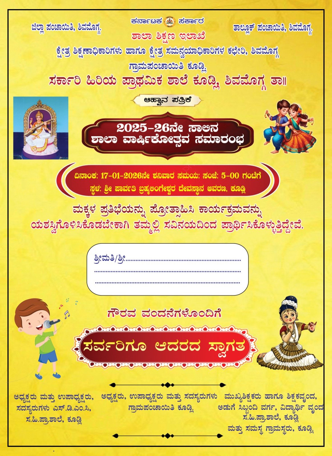 ಶಿವಮೊಗ್ಗ ತಾಲ್ಲೂಕು ಕೂಡ್ಲಿ ಗ್ರಾಮದ ಸರ್ಕಾರಿ ಹಿರಿಯ ಪ್ರಾಥಮಿಕ ಶಾಲೆಯಲ್ಲಿ 2025-26ನೇ ಸಾಲಿನ ಶಾಲಾ ವಾರ್ಷಿಕೋತ್ಸವ ಕಾರ್ಯಕ್ರಮವನ್ನು ದಿನಾಂಕ 17 ಜನವರಿ 2026 (ಶನಿವಾರ) ರಂದು ಸಂಜೆ 5.00 ಗಂಟೆಗೆ ಕೂಡ್ಲಿಯ ಶ್ರೀ ಪಾರ್ವತಿ ಬ್ರಹ್ಮ ಲಿಂಗೇಶ್ವರ ದೇವಸ್ಥಾನದ ಆವರಣದಲ್ಲಿ ಆಯೋಜಿಸಲಾಗಿದೆ.