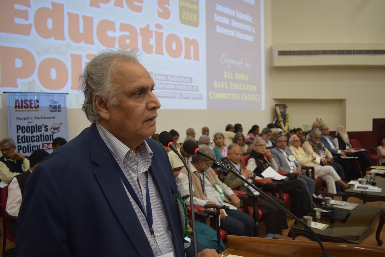 ಎಐಎಸ್ಇಸಿ ರೂಪಿಸಿದ ಜನಪರ ಶಿಕ್ಷಣ ನೀತಿ ಮತ್ತು ಈ ಜನ ಸಂಸತ್ತು ಕಾರ್ಯಕ್ರಮದ ಹಿನ್ನೆಲೆಯ ಕುರಿತು ಆರಂಭದಲ್ಲಿ ಪ್ರಧಾನ ಕಾರ್ಯದರ್ಶಿಗಳಾದ ಪ್ರೊ. ತರುಣ್ ಕಾಂತಿ ನಸ್ಕರ್ ಅವರು ಪ್ರಾಸ್ತಾವಿಕವಾಗಿ ಮಾತನಾಡಿದರು. “ಎನ್ಇಪಿ 2020ರಲ್ಲಿರುವ ಶಿಕ್ಷಣ ವಿರೋಧಿ ಅಂಶಗಳು ವಿರುದ್ಧ ದನಿ ಎತ್ತಿದಾಗ ನಾವೇ ಏಕೆ ಒಂದು ಪರ್ಯಾಯ ಮಾದರಿ ಜನಪರ ಶಿಕ್ಷಣ ನೀತಿಯನ್ನು ರೂಪಿಸಿ ಬಾರದು ಎಂಬ ಪ್ರಶ್ನೆ ಬಂತು. ಅದರಂತೆ ದೇಶದ ಹಲವಾರು ಶಿಕ್ಷಣ ತಜ್ಞರ ಸಹಕಾರದಿಂದ ಒಂದು ಕರಡು ಶಿಕ್ಷಣ ನೀತಿಯನ್ನು ರಚಿಸಿ ಮೇ 2025ರಿಂದ ಸಾರ್ವಜನಿಕ ಚರ್ಚೆಗೆ ಬಿಡಲಾಗಿದೆ. ದೇಶದ ಬಹುತೇಕ ಭಾಷೆಗಳಲ್ಲಿ ಲಕ್ಷಾಂತರ ಪ್ರತಿಗಳನ್ನು ಮುದ್ರಿಸಿ ವಿತರಿಸಲಾಯಿತು.