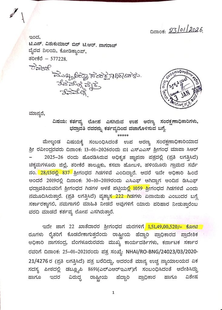 ಇದೇ ಜಾಗ 22 ಖಾತೆದಾರರ ಶ್ರೀಗಂಧದ ಮರಗಳಿಗೆ 1,51,49,00,520/- ಕೋಟಿ ರೂಗಳು ರೈತರಿಗೆ ಕೊಡಬೇಕಾಗುತ್ತದೆಂದು ರಾಷ್ಟ್ರೀಯ ಹೆದ್ದಾರಿ ಪ್ರಾಧಿಕಾರದ ಪ್ರಾದೇಶಿಕ ಅಧಿಕಾರಿ ನಾಗಸಂದ್ರ, ಬೆಂಗಳೂರುರವರು ಮುಖ್ಯ ಕಾರ್ಯದರ್ಶಿಗಳು, ಕರ್ನಾಟಕ ಸರ್ಕಾರ : 25-01-20210 : NHAI/RO-BNG/24023/03/2020-21/4276 ರ (ಪ್ರತಿ ಲಗತ್ತಿಸಿದೆ) ಪತ್ರ ಬರೆದಿದ್ದು, ಅದರಂತೆ ಮಾನ್ಯ ಉಚ್ಚ ನ್ಯಾಯಾಲಯದ ಏಕ ಸದಸ್ಯ ಪೀಠದಲ್ಲಿ ಡಬ್ಲ್ಯೂಪಿ 8691(ಎಲ್‌ಎಆರ್‌ಇಎಸ್)ಗೆ ಸಂಬಂಧಿಸಿದಂತೆ ಆದೇಶಿಸಿದ್ದು ಹಾಗೂ ಇದರ ವಿರುದ್ಧ ರಾಷ್ಟ್ರೀಯ ಹೆದ್ದಾರಿ ಪ್ರಾಧಿಕಾರ ಹಾಗೂ ವಿಶೇಷ ಭೂಸ್ವಾಧೀನಾಧಿಕಾರಿಗಳು ಮೇಲ್ಮನವಿ ಸಲ್ಲಿಸಿದ್ದು, ಡಬ್ಲೂಪಿ 5781/2020-21 (ಜಿಎಂ ಆರ್‌ಇಎಸ್ ಪಿಐಎಲ್)ರ ಅಲ್ಲಿಯೂ ಕೂಡ ಆದೇಶದಂತೆ ಪರಿಹಾರವನ್ನು ನೀಡಿದ್ದರೆ ಗಿಡ ಮರಗಳಿಗೆ ತೆರವುಗೊಳಿಸಲು ಆದೇಶ ಮಾಡಿದ್ದರೆ ಅಂದಿನ ಅಧಿಕಾರಿಗಳಿಂದ ನಮ್ಮ ರಾಜ್ಯ ಸರ್ಕಾರಕ್ಕೆ 151 ಕೋಟಿಗೆ 10% ರಂತೆ ಸುಮಾರು 15 ಕೋಟಿಗೂ ಹೆಚ್ಚು ಹಣ ಪರಿಹಾರ ಗಿಡಗಳನ್ನು ನೆಡಲು ಬರುತ್ತಿತ್ತು. ಅದನ್ನು ತಪ್ಪಿಸಿ ಇಂದಿನ ಈ ಭ್ರಷ್ಟಾಧಿಕಾರಿ ಕಡಿತಲೆ ಆದೇಶದಲ್ಲಿ ಸರ್ಕಾರಕ್ಕೆ ಬರಬೇಕಾದಂತಹ ಹಣವನ್ನು ರಾಷ್ಟ್ರೀಯ ಹೆದ್ದಾರಿ ಪ್ರಾಧಿಕಾರದಿಂದ ಕಟ್ಟಿಸಿಕೊಳ್ಳಲು ಆದೇಶ ಮಾಡದೆ ಸುಮಾರು 15 ಲಕ್ಷಕ್ಕೂ ಹೆಚ್ಚು ಹಣ ನಮ್ಮ ರಾಜ್ಯ ಸರ್ಕಾರಕ್ಕೆ ಬರುವುದನ್ನು ತಪ್ಪಿಸಿ ಕರ್ತವ್ಯ ಲೋಪವೆಸಗಿದ್ದಾರೆ ಎಂದು ಆರೋಪಿಸಿದ್ದಾರೆ.