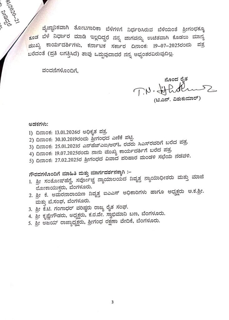 ವೈಜ್ಞಾನಿಕವಾಗಿ ತೋಟಗಾರಿಕಾ ಬೆಳೆಗಳಿಗೆ ನಿರ್ಧರಿಸಿರುವ ಬೆಳೆಯಂತೆ ಶ್ರೀಗಂಧಕ್ಕೂ ಕೂಡ ಬೆಳೆ ನಿರ್ಧಾರ ಮಾಡಿ ಇಲ್ಲದಿದ್ದರೆ ನನ್ನ ಜಾಗವನ್ನು ಉಚಿತವಾಗಿ ಕೊಡಲು ಮಾನ್ಯ ಮುಖ್ಯ ಕಾರ್ಯದರ್ಶಿಗಳು, ಕರ್ನಾಟಕ ಸರ್ಕಾರ ದಿನಾಂಕ: 19-07-2025ರಂದು ಪತ್ರ ಬರೆದಂತೆ ತಾವು ಒಪ್ಪುವುದಾದರೆ ನನ್ನ ಅಭ್ಯಂತರವಿರುವುದಿಲ್ಲವೆಂದು ತಿಳಿಸದ್ದಾರೆ.