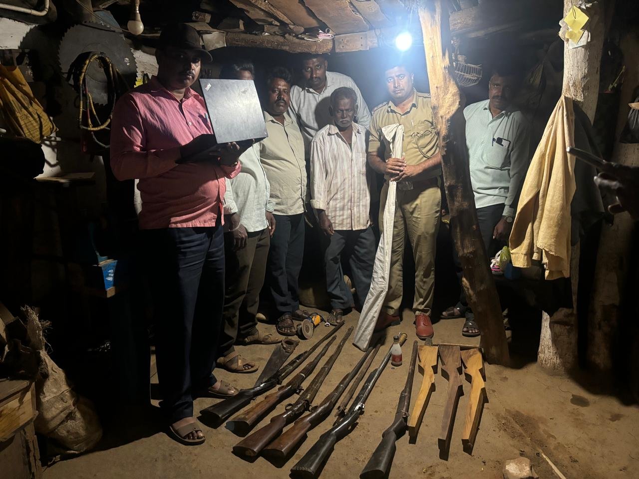 ನಂತರ ಮಾನ್ಯ ಪೊಲೀಸ್ ಅಧೀಕ್ಷಕರು ಶಿವಮೊಗ್ಗ ಜಿಲ್ಲೆ ಶ್ರೀ ನಿಖಿಲ್ ಬಿ. ಐಪಿಎಸ್ ಅವರ ಮಾರ್ಗದರ್ಶನದಲ್ಲಿ, ಹೆಚ್ಚುವರಿ ಪೊಲೀಸ್ ಅಧೀಕ್ಷಕರು ಶ್ರೀ ಎ.ಜಿ. ಕಾರಿಯಪ್ಪ ಹಾಗೂ ಶ್ರೀ ರಮೇಶ್ ಅವರ ನಿರ್ದೇಶನದಂತೆ, ಪೊಲೀಸ್ ಉಪಾಧೀಕ್ಷಕರು ಶಿಕಾರಿಪುರ ಉಪವಿಭಾಗದ ಶ್ರೀ ಕೇಶವ ಕೆ.ಇ ಅವರ ಮೇಲ್ವಿಚಾರಣೆಯಲ್ಲಿ ಸಿಪಿಐ ಸಂತೋಷ್ ಎಂ. ಪಾಟೀಲ್ ಅವರ ನೇತೃತ್ವದಲ್ಲಿ ವಿಶೇಷ ತಂಡವನ್ನು ರಚಿಸಲಾಯಿತು.ಮಾನ್ಯ ನ್ಯಾಯಾಲಯದಿಂದ ಸರ್ಚ್ ವಾರೆಂಟ್ ಪಡೆದು ದಿ.04-02-2026ರಂದು ಸಂಜೆ 6 ಗಂಟೆ ಸುಮಾರಿಗೆ ಆರೋಪಿತನ ಮನೆಯ ಮೇಲೆ ದಾಳಿ ನಡೆಸಿದ ಪೊಲೀಸರು, ಹಳೆಯ ಮನೆಯೊಳಗೆ ಬಚ್ಚಿಟ್ಟಿದ್ದ 7 ಸಿಂಗಲ್ ಬ್ಯಾರಲ್ ನಾಡಬಂದೂಕುಗಳು ಹಾಗೂ ಸಂಬಂಧಿತ ಇತರೆ ವಸ್ತುಗಳನ್ನು ಜಪ್ತಿ ಮಾಡಿಕೊಂಡಿದ್ದಾರೆ.