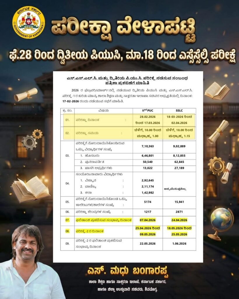 ಬೆಂಗಳೂರು, ರಾಜ್ಯದ ದ್ವಿತೀಯ ಪಿಯುಸಿ ಹಾಗೂ ಎಸ್ಎಸ್ಎಲ್ಸಿ ಪರೀಕ್ಷೆಗಳ ದಿನಾಂಕಗಳನ್ನು ಶಿಕ್ಷಣ ಸಚಿವ ಮಧು ಬಂಗಾರಪ್ಪ ಪ್ರಕಟಿಸಿದ್ದಾರೆ.