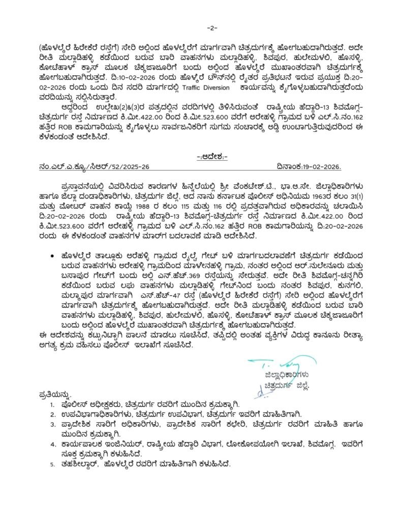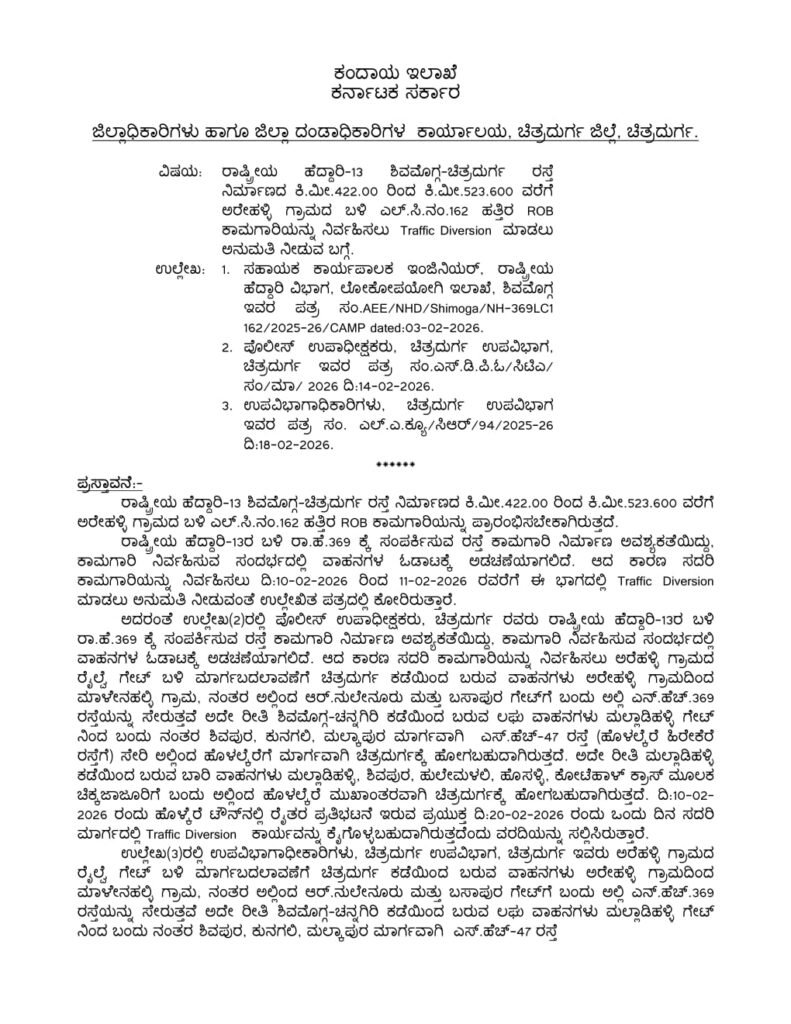 ಪ್ರಸ್ತಾವನೆಯಲ್ಲಿ ವಿವರಿಸಿರುವ ಕಾರಣಗಳ ಹಿನ್ನೆಲೆಯಲ್ಲಿ ವೆಂಕಟೇಶ್.ಟಿ., ಭಾ.ಆ.ಸೇ. ಜಿಲ್ಲಾಧಿಕಾರಿಗಳು ಹಾಗೂ ಜಿಲ್ಲಾ ದಂಡಾಧಿಕಾರಿಗಳು, ಚಿತ್ರದುರ್ಗ ಜಿಲ್ಲೆ, ಆದ ನಾನು ಕರ್ನಾಟಕ ಪೊಲೀಸ್ ಅಧಿನಿಯಮ 1963ರ ಕಲಂ 31(1) ಮತ್ತು ಮೋಟರ್ ವಾಹನ ಕಾಯ್ದೆ 1988 ರ ಕಲಂ 115 ಮತ್ತು 116 ರಲ್ಲಿ ಪ್ರದತ್ತವಾಗಿರುವ ಅಧಿಕಾರವನ್ನು ಚಲಾಯಿಸಿ ದಿ:20-02-2026 ರಂದು ರಾಷ್ಟ್ರೀಯ ಹೆದ್ದಾರಿ-13 ಶಿವಮೊಗ್ಗ-ಚಿತ್ರದುರ್ಗ ರಸ್ತೆ ನಿರ್ಮಾಣದ ಕಿ.ಮೀ.422.00 ರಿಂದ ಕಿ.ಮೀ.523.600 ವರೆಗೆ ಅರೇಹಳ್ಳಿ ಗ್ರಾಮದ ಬಳಿ ಎಲ್.ಸಿ.ನಂ.162 ಹತ್ತಿರ ROB ಕಾಮಗಾರಿಯನ್ನು ದಿ:20-02-2026 ರಂದು ಈ ಕೆಳಕಂಡಂತೆ ವಾಹನಗಳ ಮಾರ್ಗ ಬದಲಾವಣೆ ಮಾಡಿ ಆದೇಶಿಸಿದೆ.ಹೊಳಲ್ಕೆರೆ ತಾಲ್ಲೂಕು ಅರೆಹಳ್ಳಿ ಗ್ರಾಮದ ರೈಲ್ವೆ ಗೇಟ್ ಬಳಿ ಮಾರ್ಗಬದಲಾವಣೆಗೆ ಚಿತ್ರದುರ್ಗ ಕಡೆಯಿಂದ ಬರುವ ವಾಹನಗಳು ಅರೇಹಳ್ಳಿ ಗ್ರಾಮದಿಂದ ಮಾಳೇನಹಳ್ಳಿ ಗ್ರಾಮ, ನಂತರ ಅಲ್ಲಿಂದ ಆರ್.ನುಲೇನೂರು ಮತ್ತು ಬಸಾಪುರ ಗೇಟ್ಗೆ ಬಂದು ಅಲ್ಲಿ ಎನ್.ಹೆಚ್.369 ರಸ್ತೆಯನ್ನು ಸೇರುತ್ತವೆ.