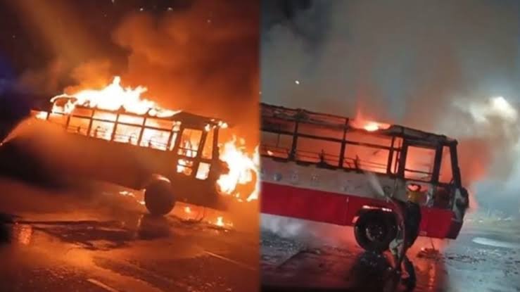 ಬೆಂಗಳೂರು, ನಗರದ ಪ್ರಸಿದ್ಧ ಲುಲು ಮಾಲ್‌ ಮುಂದೆ ಕೆಎಸ್‌ಆರ್‌ಟಿಸಿ ಬಸ್ಸೊಂದು ಹೊತ್ತಿ ಉರಿದ ಘಟನೆ ಗುರುವಾರ ರಾತ್ರಿ ನಡೆದಿದೆ.ರಾತ್ರಿ 10:15ಕ್ಕೆ ಮೆಜೆಸ್ಟಿಕ್ ಬಸ್ ನಿಲ್ದಾಣದಿಂದ ಶಿವಮೊಗ್ಗಕ್ಕೆ ಕರ್ನಾಟಕ ಸಾರಿಗೆ ಬಸ್‌ ಹೊರಟಿತ್ತು. ಲುಲು ಮಾಲ್‌ ಬಳಿ ರಾತ್ರಿ 10:20 ತಲುಪುವಾಗ ಬಸ್ಸಿನ ಕೆಳ ಭಾಗದಲ್ಲಿ ಬೆಂಕಿ ಕಾಣಿಸಿಕೊಂಡಿದೆ.