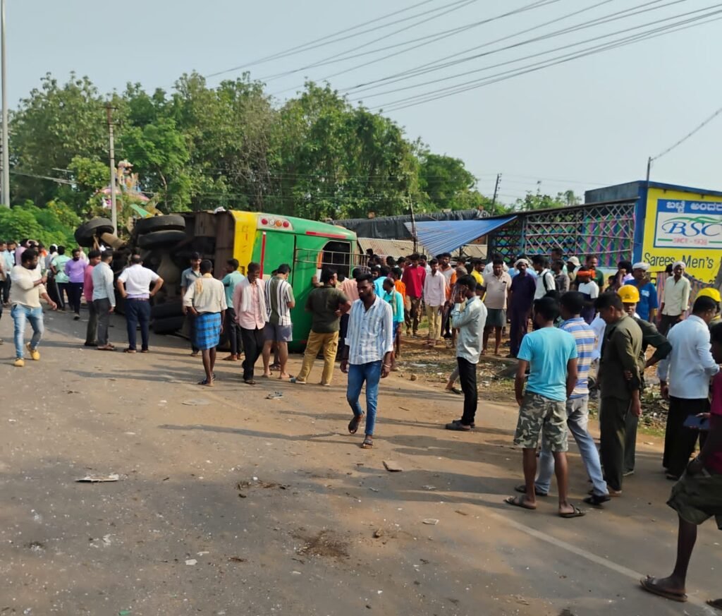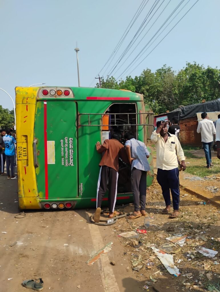 ಈ ಭರದಲ್ಲಿ ನಿಯಂತ್ರಣ ತಪ್ಪಿದ ಬಸ್ ರಸ್ತೆ ಬದಿಯ ವಿದ್ಯುತ್ ಕಂಬಕ್ಕೆ ಡಿಕ್ಕಿ ಹೊಡೆದು ಪಲ್ಟಿಯಾಗಿದೆ. ಘಟನೆಯಲ್ಲಿ ಬಸ್ಸಿನಲ್ಲಿದ್ದ ಪ್ರಯಾಣಿಕರಿಗೆ ಗಾಯವಾಗಿದೆ.